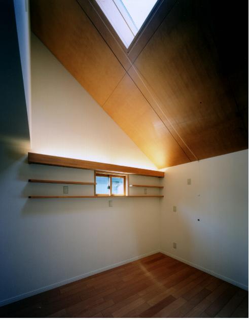 開放的な間取りの2階で戸があるのは、ここ寝室とトイレだけです。間接照明と押さえた窓の大きさで、ほの