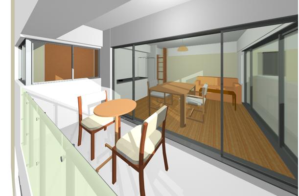 総床面積の広い、リビングと寝室を完全に分離したタイプです。バルコニー奥の窓は寝室のものです。
